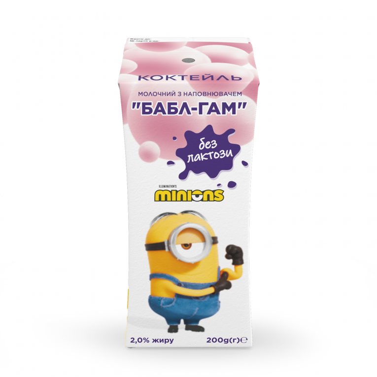 Коктейль молочний безлактозний ультрапастеризований з фруктовим наповнювачем «Зі смаком Бабл-Гам», 2,0% жиру, ТМ «MINIONS», 200 г